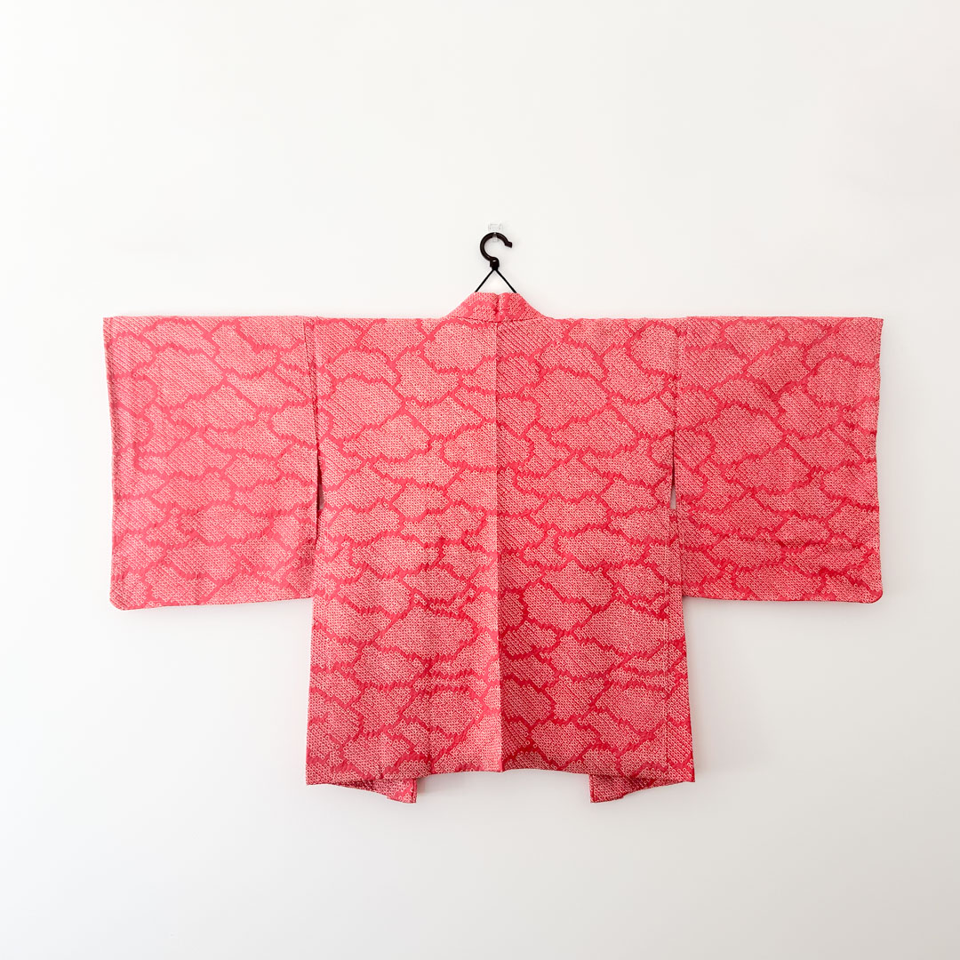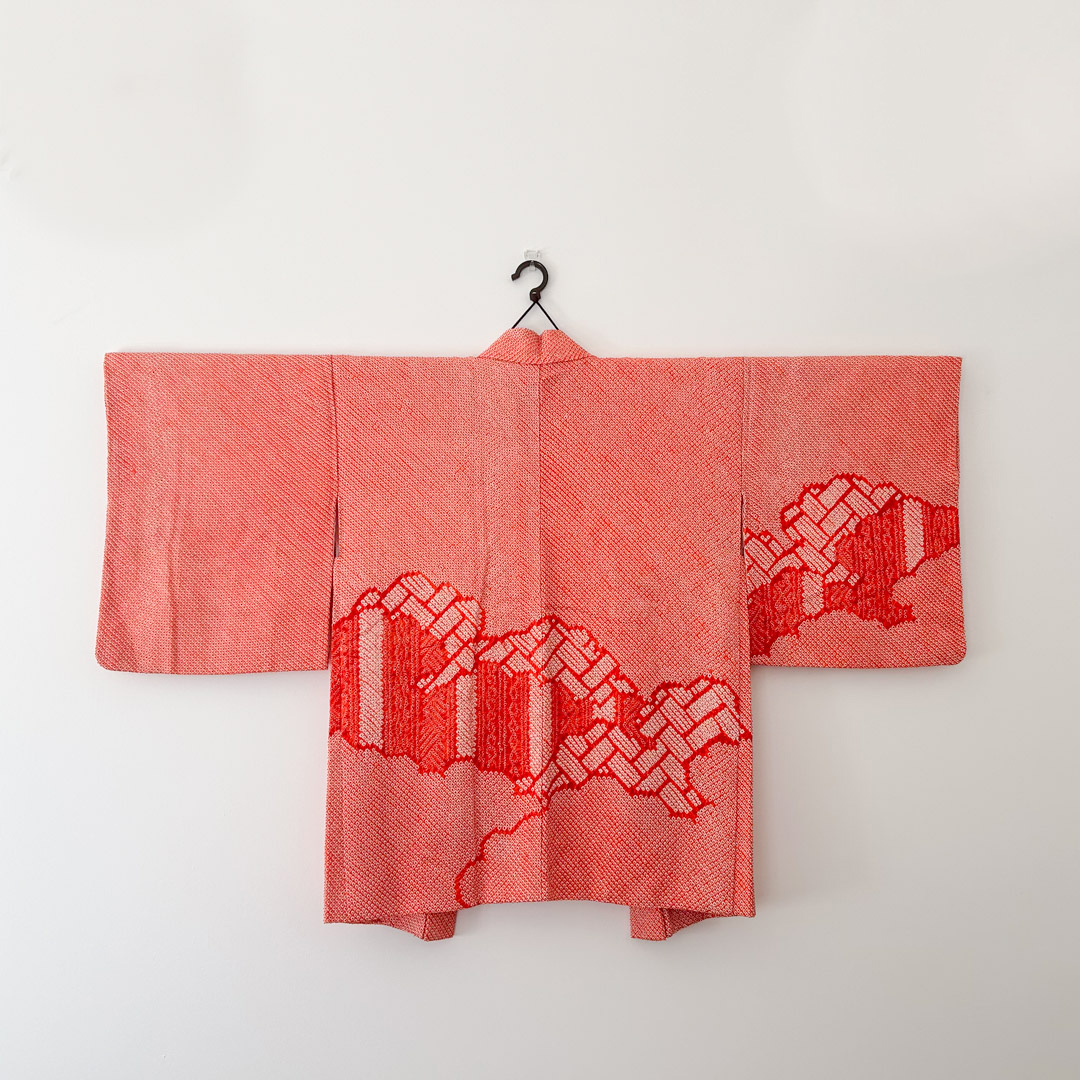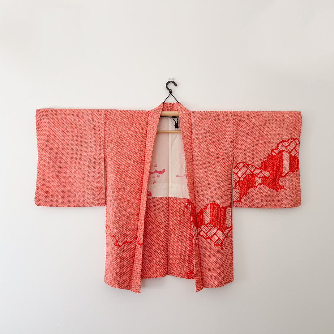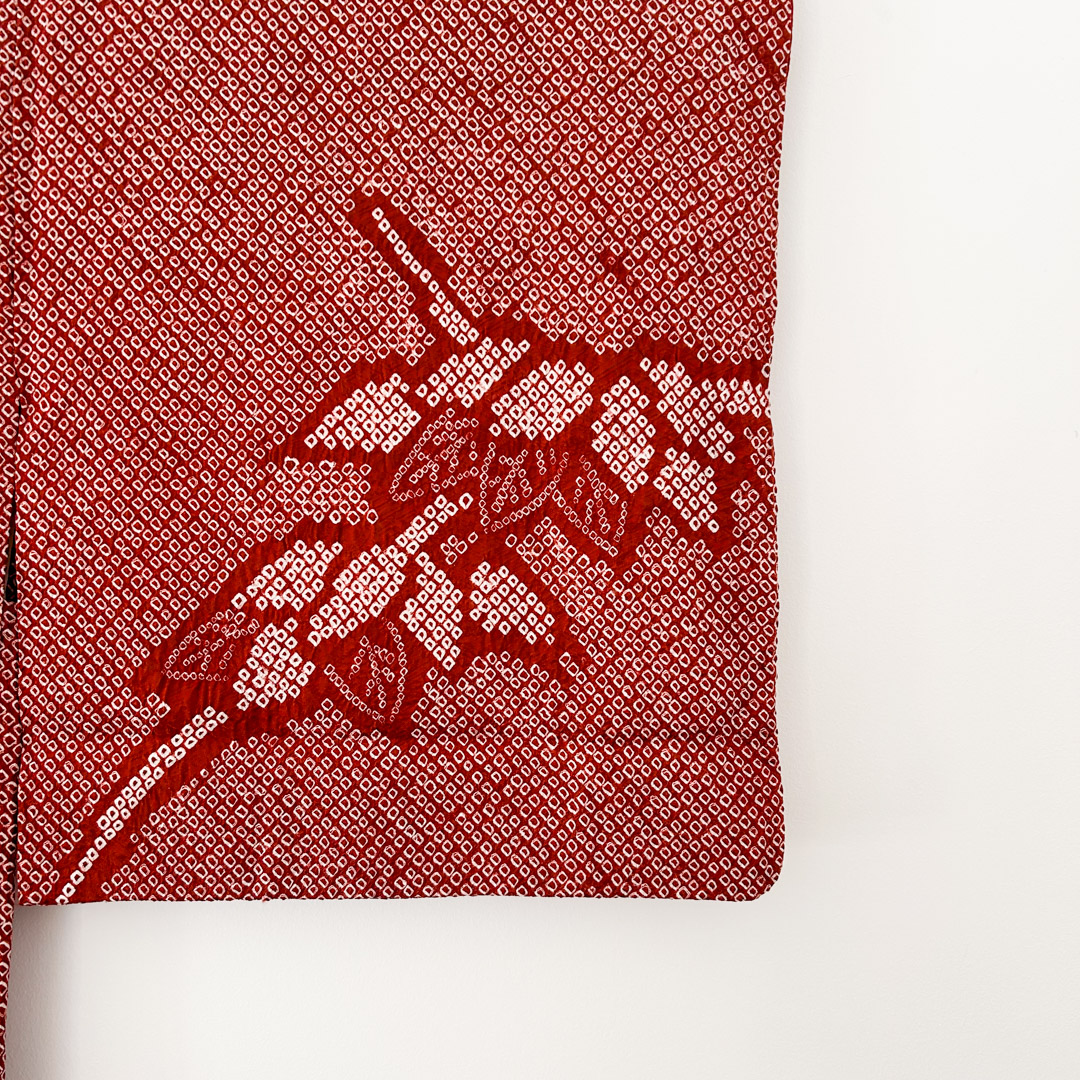 Haori vintage japonais – soie rouge vif à motif shibori et doublure aux fleurs de prunier