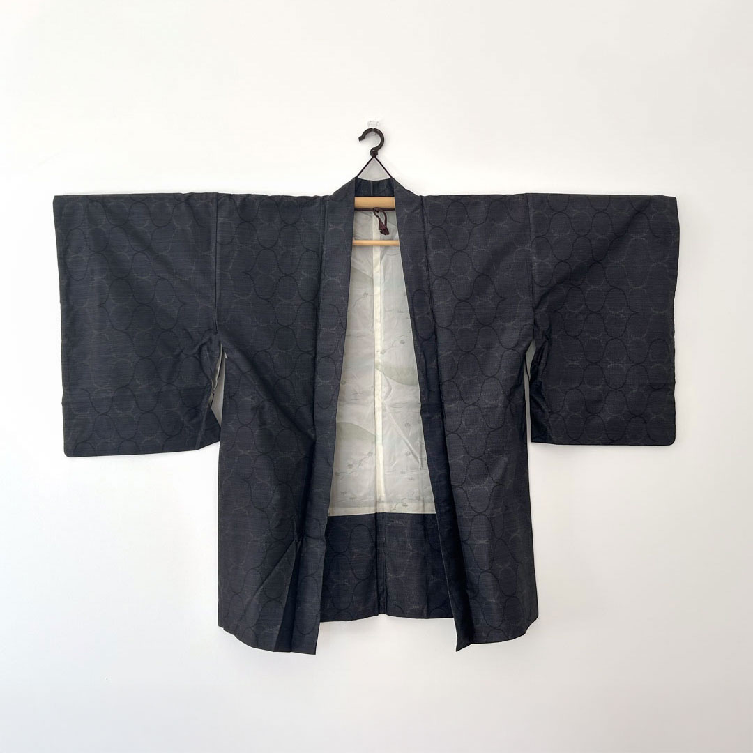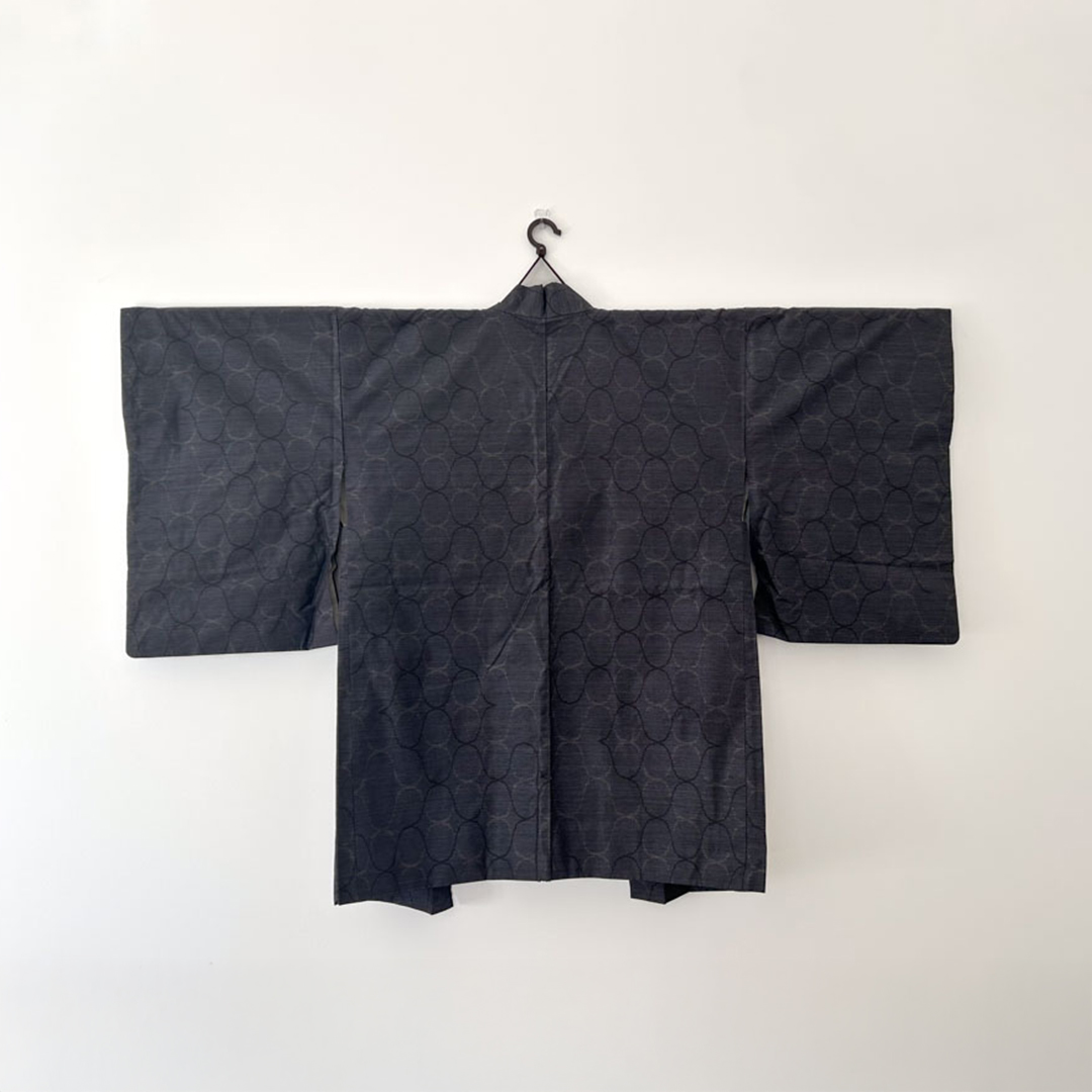 Haori vintage japonais – polyester gris bleu à motifs circulaires et doublure paysage