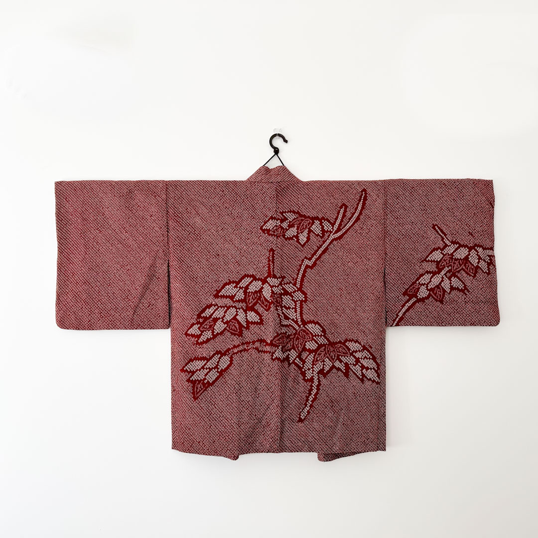 Haori japonais vintage – shibori bordeaux à doublure florale satinée