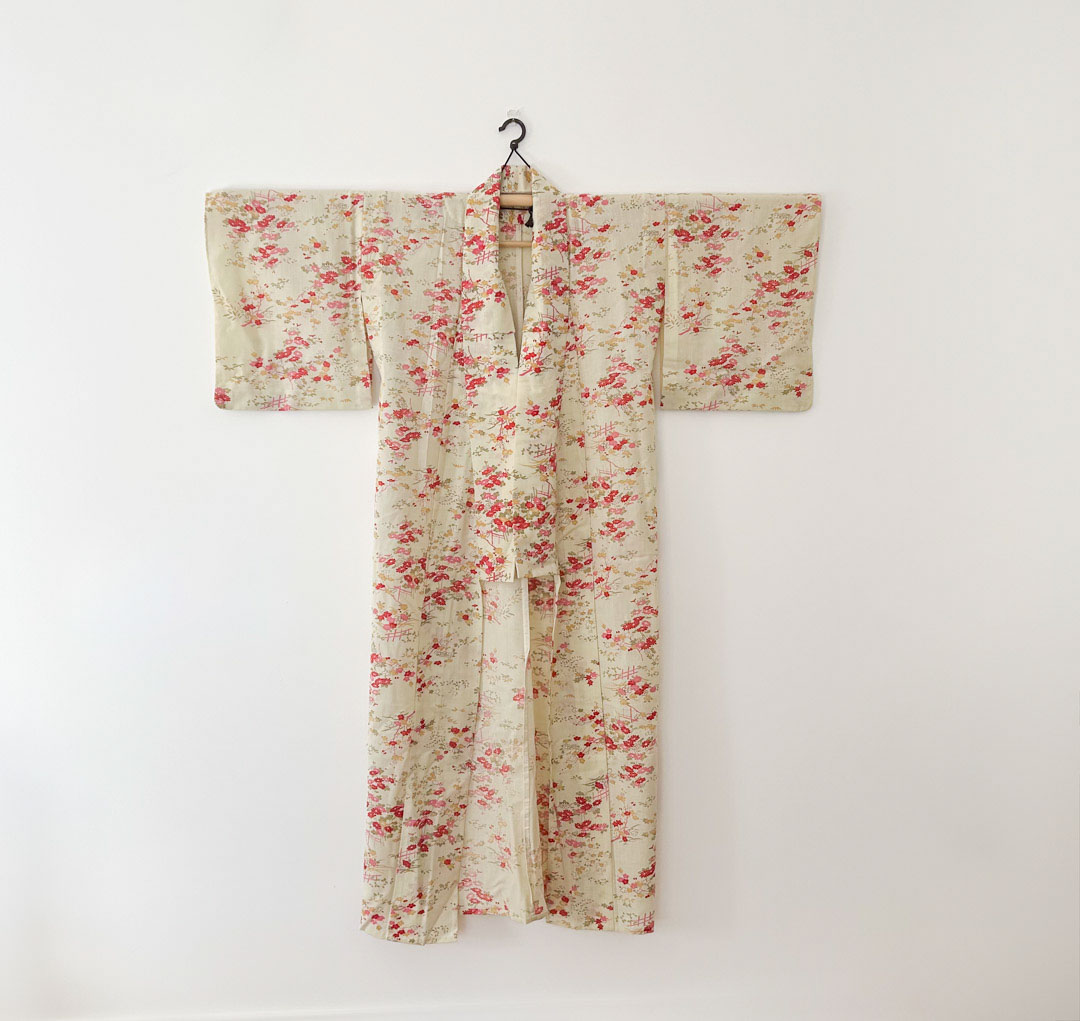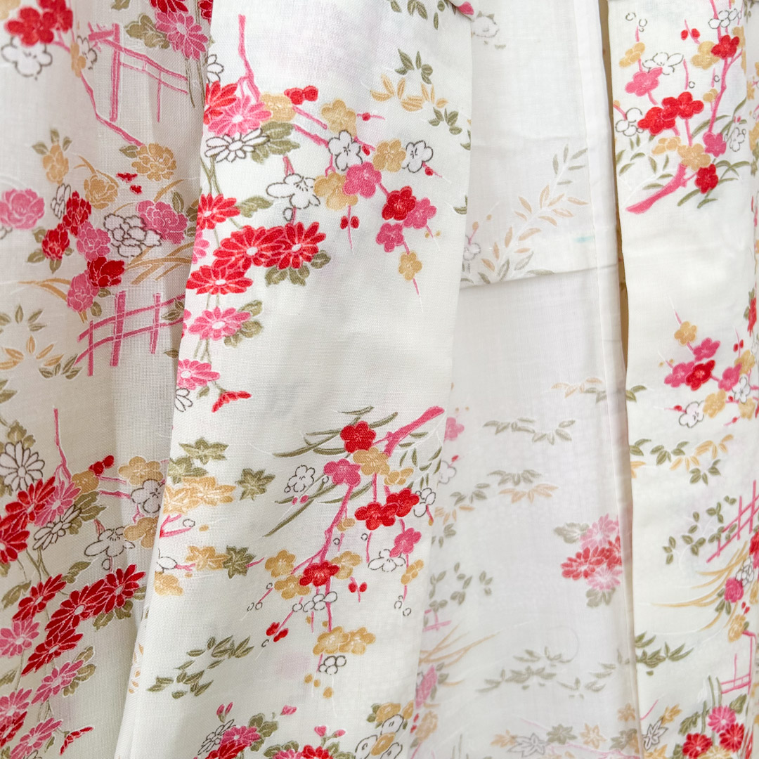 Kimono japonais – tons crème, motifs floraux traditionnels (kiku, ume, érables)