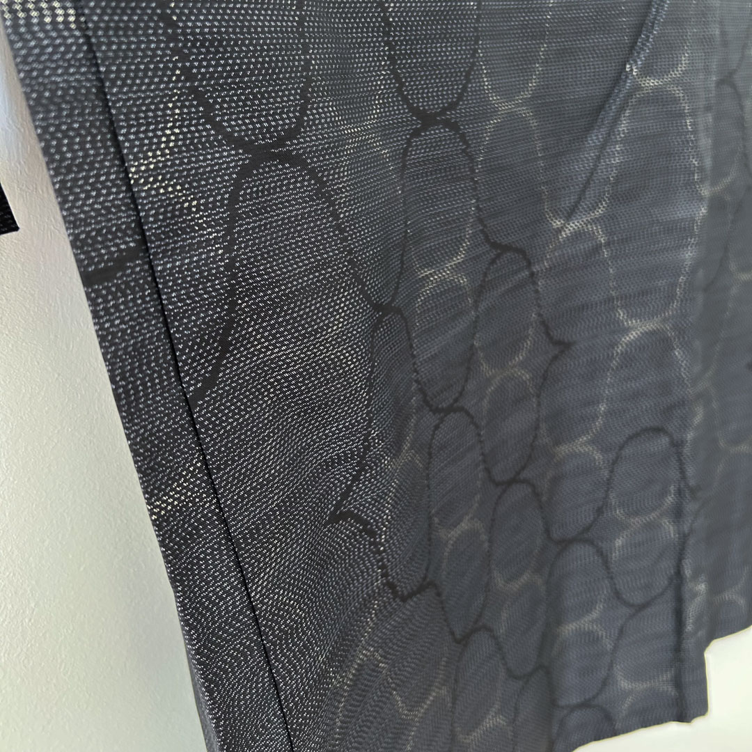 Son coloris gris bleuté, proche du bleu marine, révèle au fil de la lumière un motif traditionnel composé de cercles harmonieux — un design subtil qui apporte profondeur et raffinement à la silhouette.