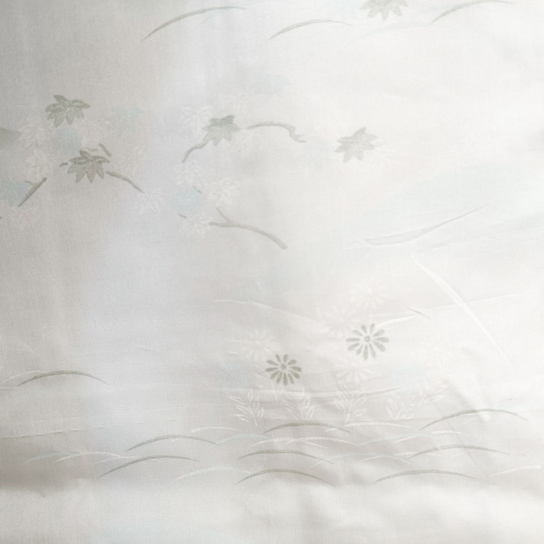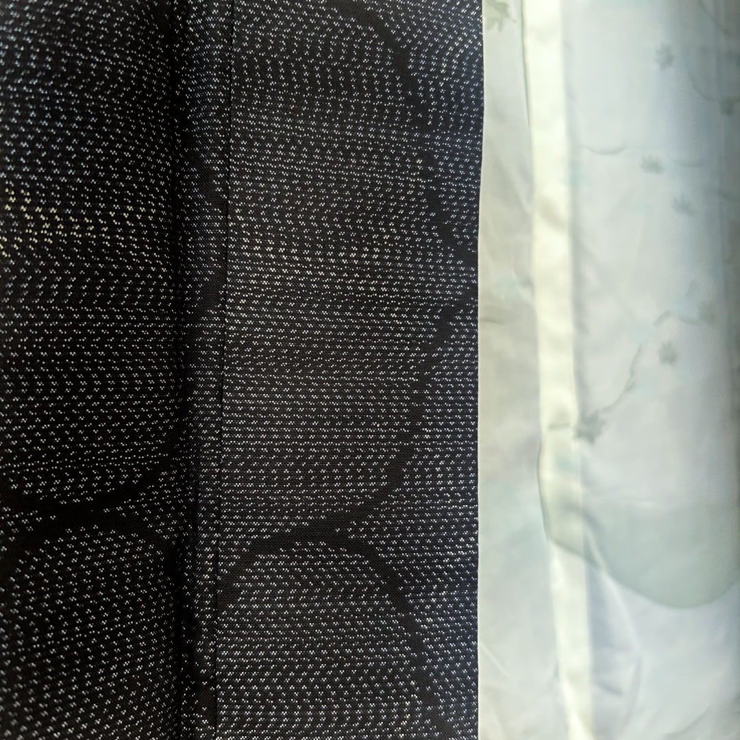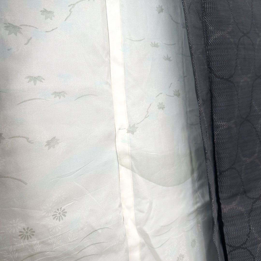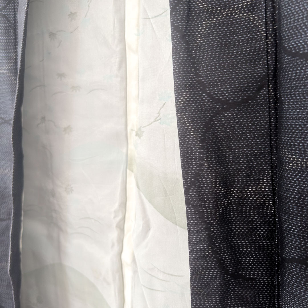 La doublure en ton blanc et noir présente une scène évoquant les paysages japonais : fleurs, montagnes et nature stylisée. Un contraste poétique, à la fois sobre et graphiquement puissant.