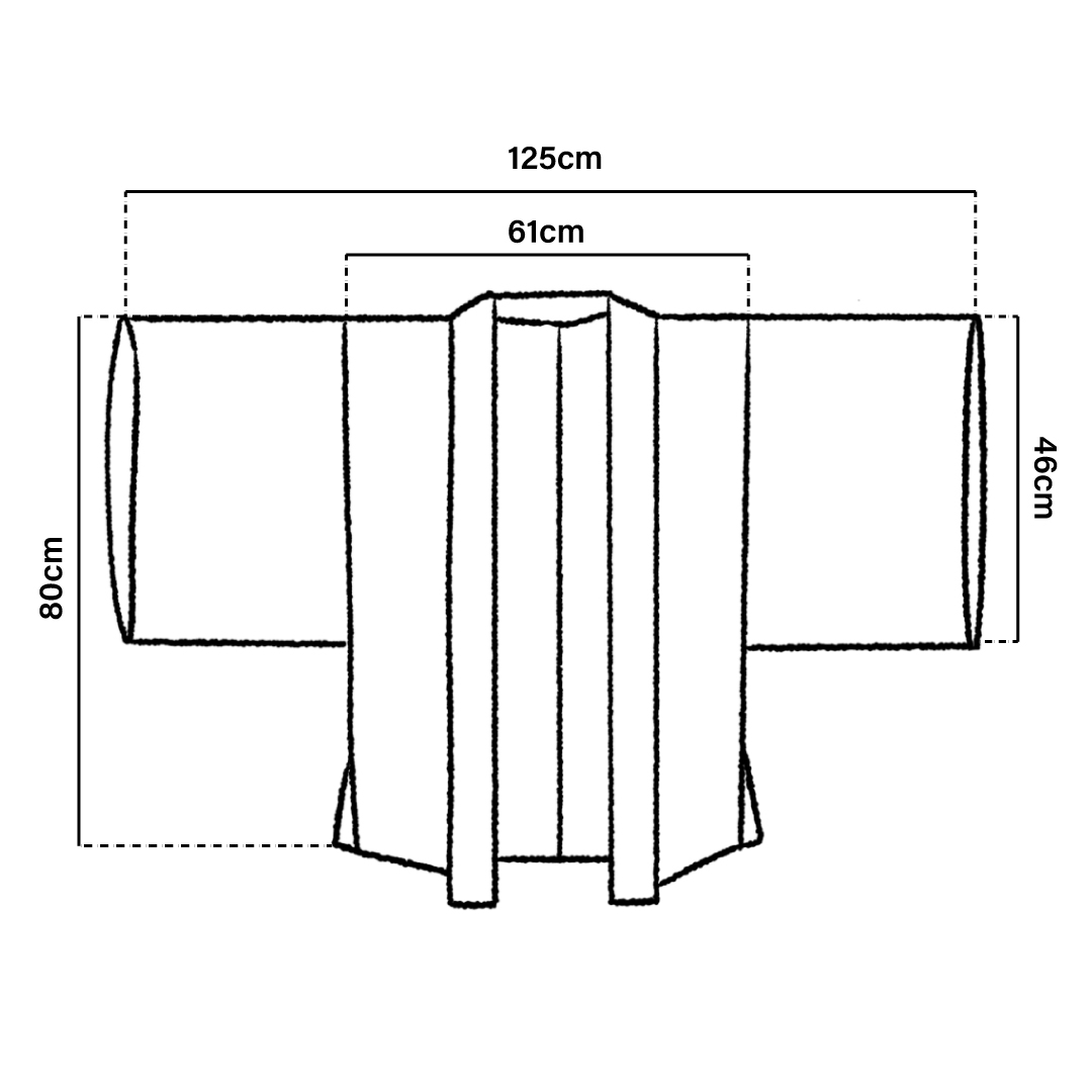 À l’avant, deux cordons de fermeture en tissu assorti permettent de porter le haori ouvert ou élégamment fermé.